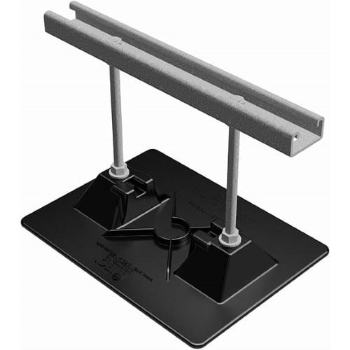 A pipe support with “Strut” is used to support roof-mounted electrical conduit, solar piping, gas pipes, and other mechanical piping. It’s unique design absorbs thermal expansion and contraction of pipe while preventing damage to the roof membrane. The pipe will rest on a 12 in. strut which is mounted to the base, and can be fastened by using the appropriate pipe clamp