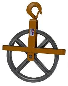 Accept no substitutes! All Roofmaster Hoisting Wheels feature the highest quality die-cast aluminum wheels. These wheels are made in the U.S.A. Incorporate that with maintenance-free bearings, plus an all-steel framework. Traditional gin wheel has an extra-heavy-duty forged swivel hook with safety clip You can tap the wheel and it has a ring, not like imported or yellow imitation “sand casted” wheels that will break if dropped.